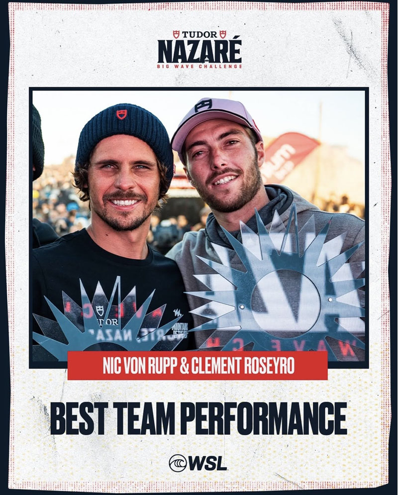 Una demostración increíble de compromiso, conocimiento local y horas en el lineup de Nazaré permitió que el héroe local Nic von Rupp (POR) y Clement Roseyro (FRA) retuvieran su título a la Mejor Actuación en Equipo. En total sintonía con el océano, eligieron las mejores olas del día para una actuación dominante.